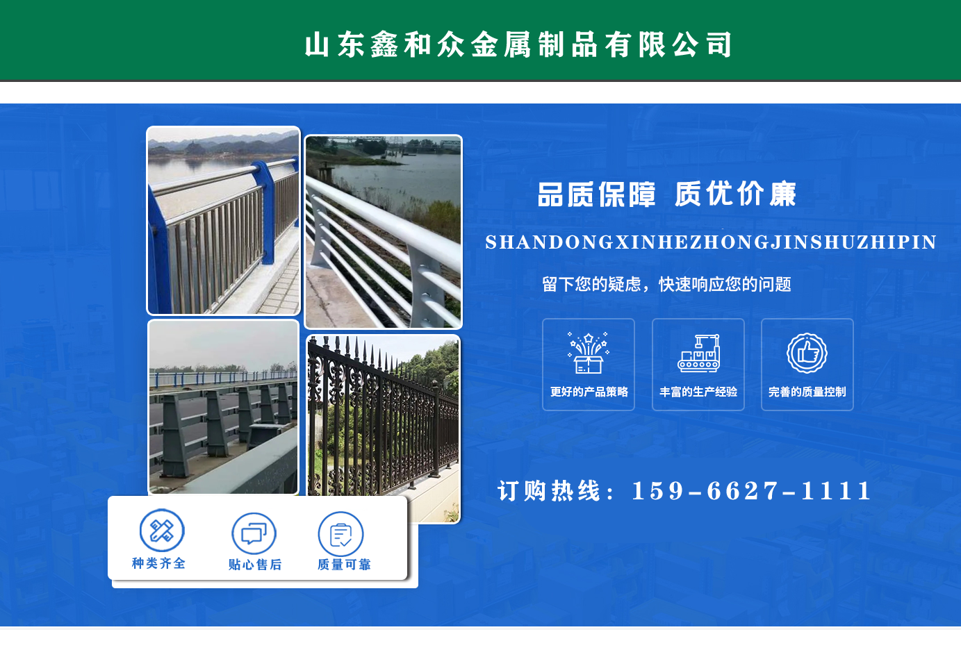山東鑫和眾金屬制品有限公司主要產品有防撞護欄,橋梁護欄,道路護欄,河道護欄,不銹鋼護欄等護欄。提供設計方案,一站式定制,包您滿意價格優(yōu)惠,歡迎來電咨詢! 公司常年從事銷售護欄防撞護欄,橋梁護欄,道路護欄,河道護欄,不銹鋼護欄,橋梁鋼護欄,河道燈光護欄等。產品廣泛應用于橋梁、河道、旅游景區、道路、公路、公園、小區、景觀、道路防撞等領域。 公司產品均采用優(yōu)質不銹鋼材料,符合相關標準。各種型號不銹鋼復合管及護欄,質量嚴格把控。產品強度高、耐腐蝕、焊接牢固、抗沖擊、性能好,防撞護欄結構簡單、美觀實用大方。 歡迎前來訂購!...